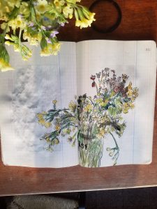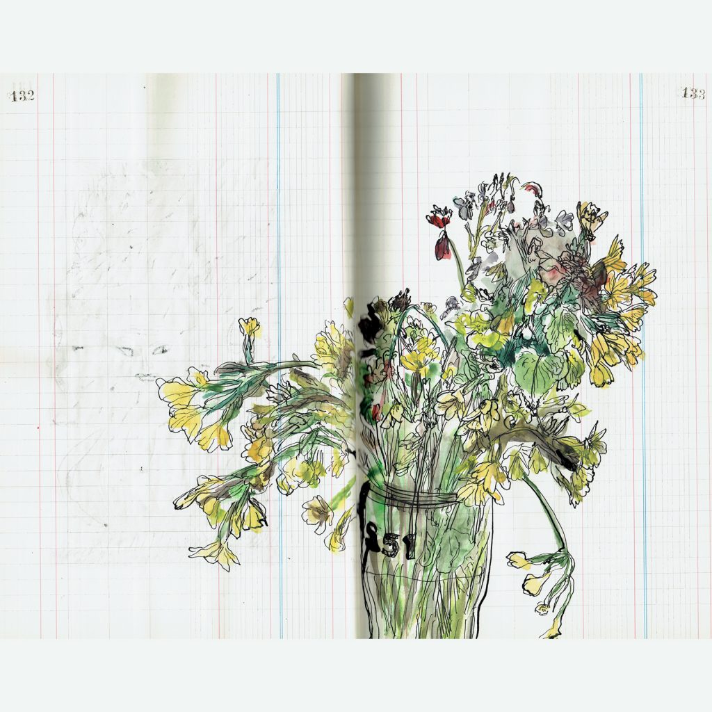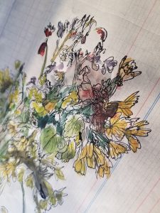 « Habitant habituellement la ville (Bourg-en-Bresse dans en Rhône-Alpes), j’ai choisi de me confiner chez des amis à la campagne. Tout est chamboulé, ma vie y compris mais pour moi ce confinement a un effet d’ouverture, je me ballade, regarde le printemps qui fait jaillir le vert partout. Je connais ma chance, je dessine chaque jour, parfois ce que je cueille, d’autres fois des croquis ou aussi beaucoup d’imagination. Cette oeuvre est un bouquet cueilli lors d’une de ces promenades. Je n’ai jamais été aussi heureux d’accueillir mes allergies au pollen. Mes pensées vont néanmoins à tous ceux qui n’ont pas la même chance, culpabiliser ne sert à rien mais tenter de prendre soin est déjà beaucoup.