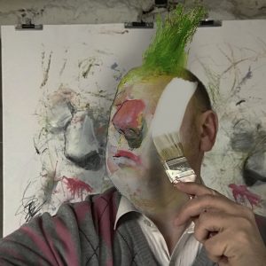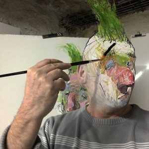 Plus on travaille, plus on disparaît et plus on devient son oeuvre. Je pense que le désir d’un artiste, c’est de devenir son oeuvre. Finalement, on joue sa propre vie pour la vivre réellement : on joue la tristesse, on joue la révolte, on joue le bonheur. On est montreur, on n’est que montreur, on n’a plus de vie tout comme un acteur de théâtre. Ici aux confins, Guiome David s’intègre à sa peinture, comme une prise de pouvoir de son art sur les moyens dont il dispose. Comme une prise de position de l’art face au confinement. Il crève le portrait. Exploite le moi et délivre pleinement son potentiel imaginaire.