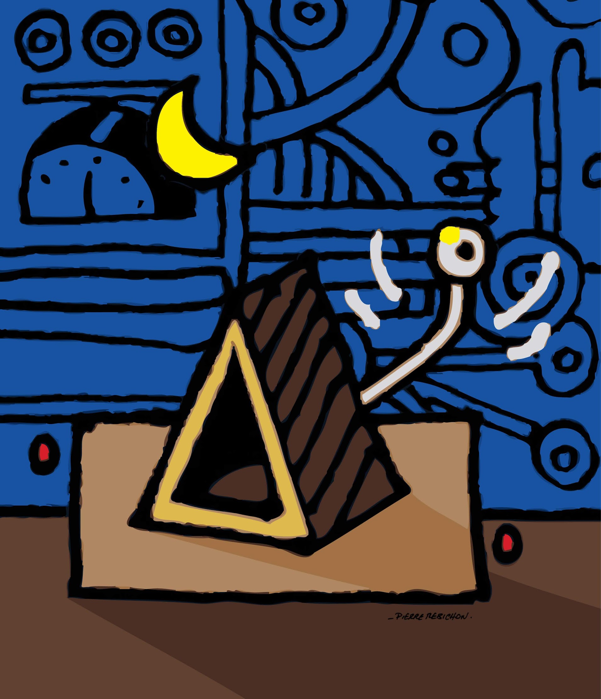 « C’est un tracé au pinceau, encre de chinependant que mon ordinateur calcule un fichier (3D). Je numérise en JPG le dessin réalisé en mode instinctif sansaucune réflexion particulière, et met en couleur sur photoshop.Puis pour adoucir les contours et gagner en qualité.Digigraphie® en vue (comme d’ab),je vectorise ce dessin manuel (sur Adobe illustrator). Pendant ce petit moment le titre me vient à l’esprit… «