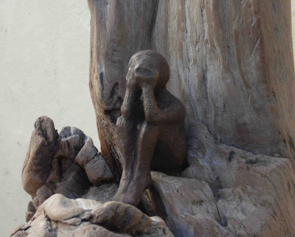 « Pendant ce confinement, c’est la débrouille…mes sculptures qui naissent de l’argile sont en mal de matière première qu’il est difficile de trouver, alors j’économise je fais, je défais, je refais, et puis parfois j’assemble les matières au gré de ce que je trouve. Paradoxalement, le fait de vivre avec le manque du tout possible, ouvre d’autres possibles et aiguise la créativité et l’imaginaire. »