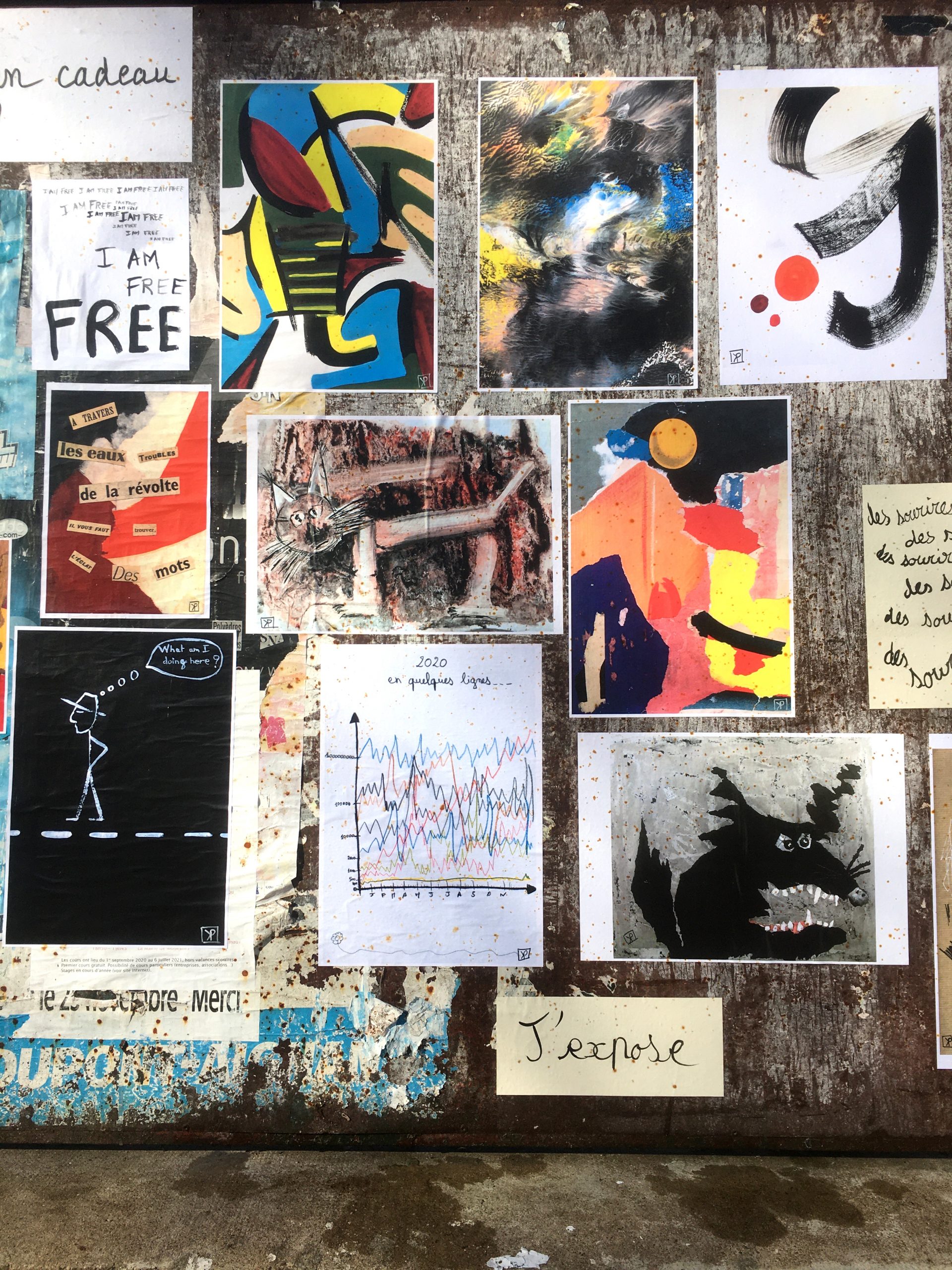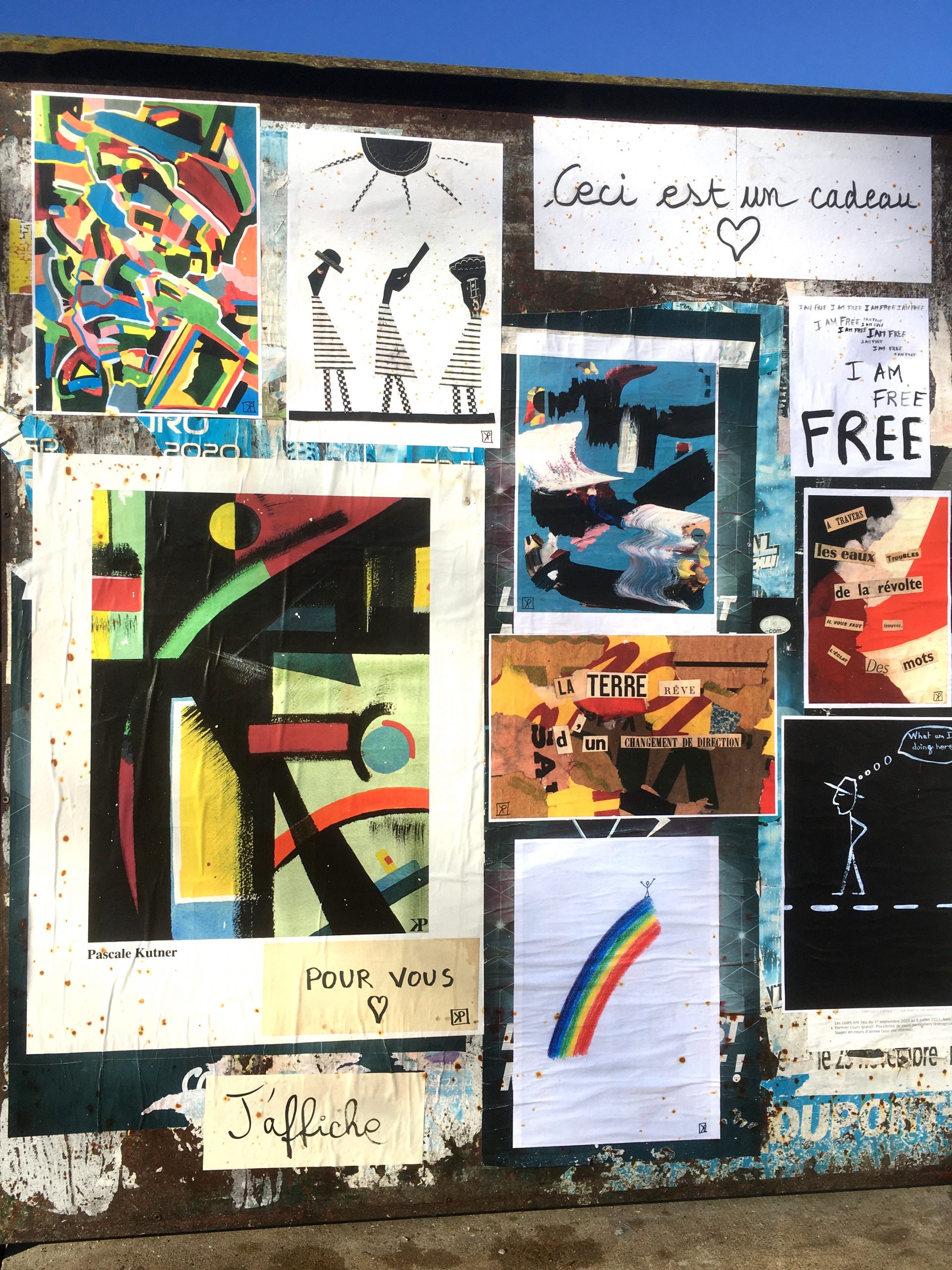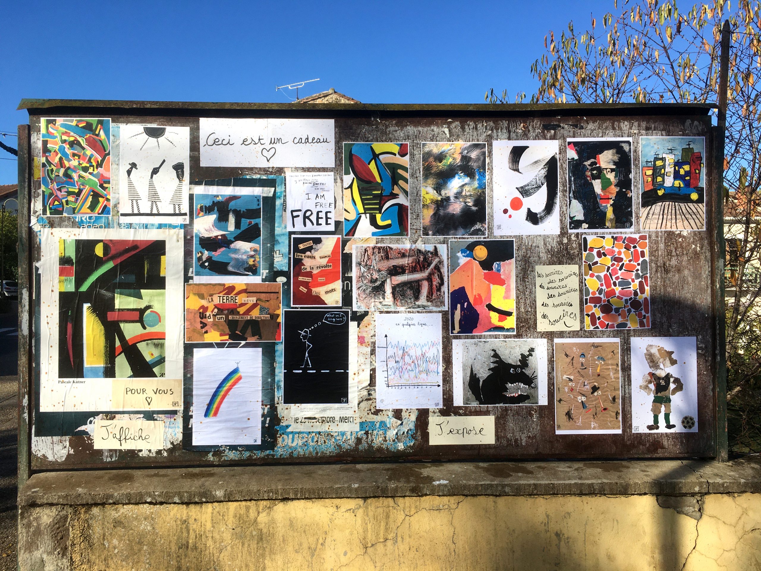 J’ai pris mon courage à deux mains, mon escabeau, mon pot de colle et mes photocopies et je me suis offert le luxe d’une exposition personnelle, dans la rue principale de mon village, sur ce panneau d’affichage Public désespérément vide d’évènements festifs à venir et qui m’a dit : « Vas-y Pascale ! , profites-en pour t’offrir et offrir ce cadeau aux passants. »