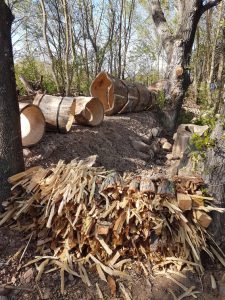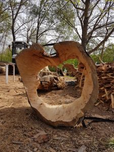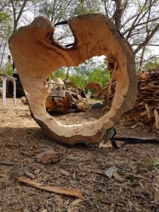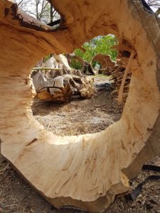 La répétition du geste conduit à l’unité de l’œuvre, son vécu. neuf jours pour réaliser cette sculpture. Vous prenez dix rondins de bois. En les assemblant vous restituez la forme initiale du tronc. Vous mettez neuf cernes annuels de croissance à jour. De 2006 à 2015 . Puis vous creusez. Vous évidez chaque partie du tronc exception faite de ces neuf années susmentionnées. Vous mettez à jour en 2020, l’énergie nécessaire à la croissance de l’arbre de 2006 à 2015. Le temps de la mise en œuvre, vous coïncidez avec le temps de l’arbre sur neuf années.