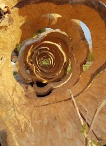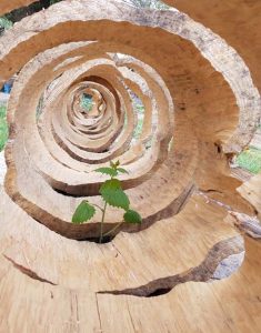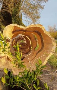 Un surplus d’énergie, plus de masse, une spirale à l’intérieur du tronc segmenté et évidé qui parle de la croissance de l’arbre et qui en même temps absorbe la lumière du soleil en une autre spirale inversée. Deux spirales valent mieux qu’une. Je suis seul. Seul au monde et ce n’est plus de la solitude mais une connivence et une adhésion avec tout ce que formule le vivant.
